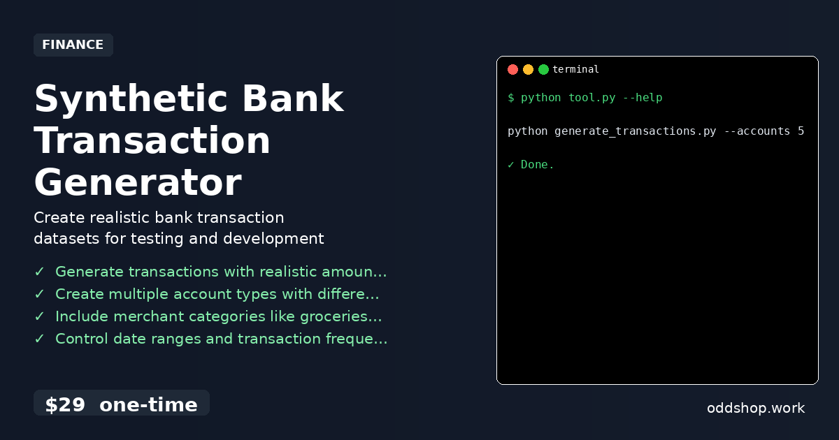 If you’re building applications that need a realistic set of bank entries, using Python to generate this data is a much faster approach. This Python script leverages python data automation to quickly produce a CSV file with 12 months of fake bank records. It’s not perfect — it’s designed for prototyping and testing — but it gets the job done without manual input.